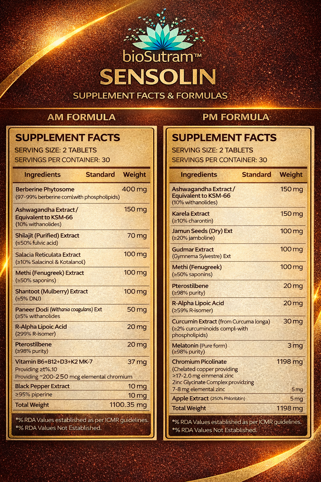 SENSOLIN™ is a scientifically designed day–night metabolic correction system that works in sync with your body’s natural rhythm to deliver 24-hour glucose control, insulin sensitivity enhancement, and metabolic repair.
